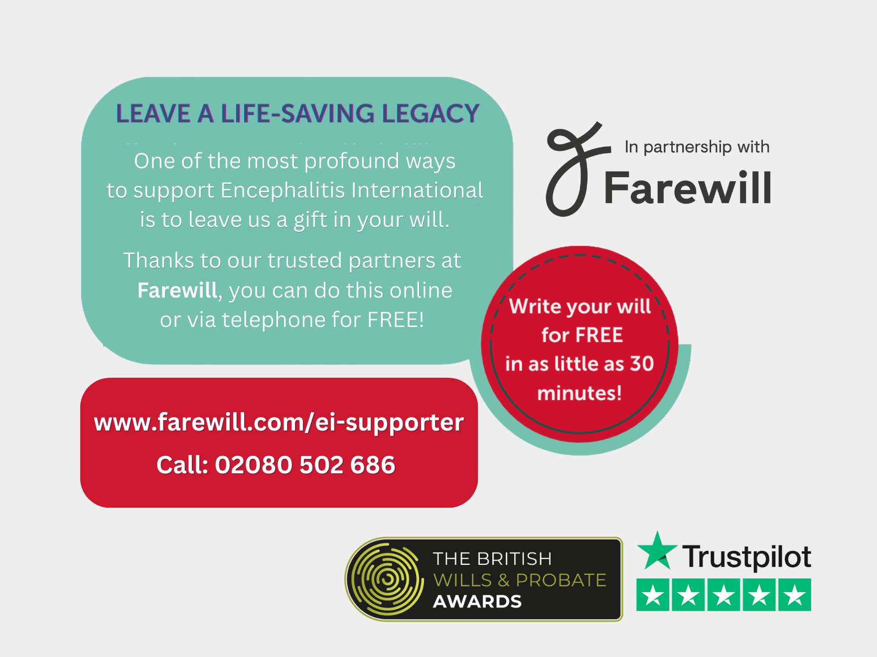 Lines are open 9am to 6pm, Monday to Friday (GMT). Please ensure you tell Farewill that you would like to take advantage of using Encephalitis International’s free will service at the start of your call, so they can remove the usual charge.