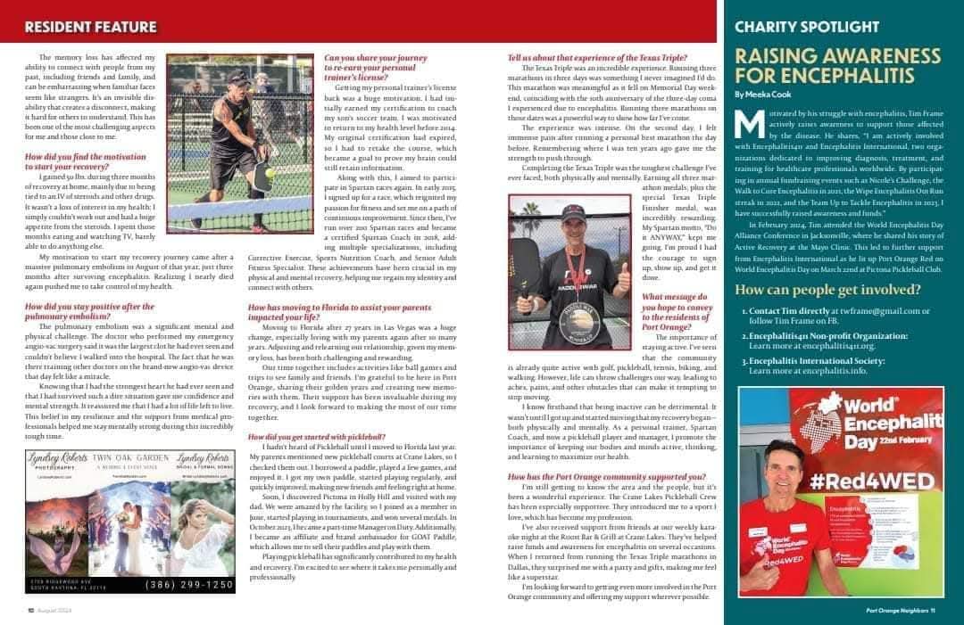 So this was a much MORE memorable weekend, and one I’m very proud of accomplishing. I wore a Encephalitis International running jersey on all 3 days of racing, and helped raise awareness in the running community, and in my home town as well. That’s because I was also featured in a local Port Orange Magazine in August, that shared my story too, and helped raise awareness for encephalitis in my local community too, which featured a charity highlight page, that featured both Encephalitis International and Encephalitis411 too.